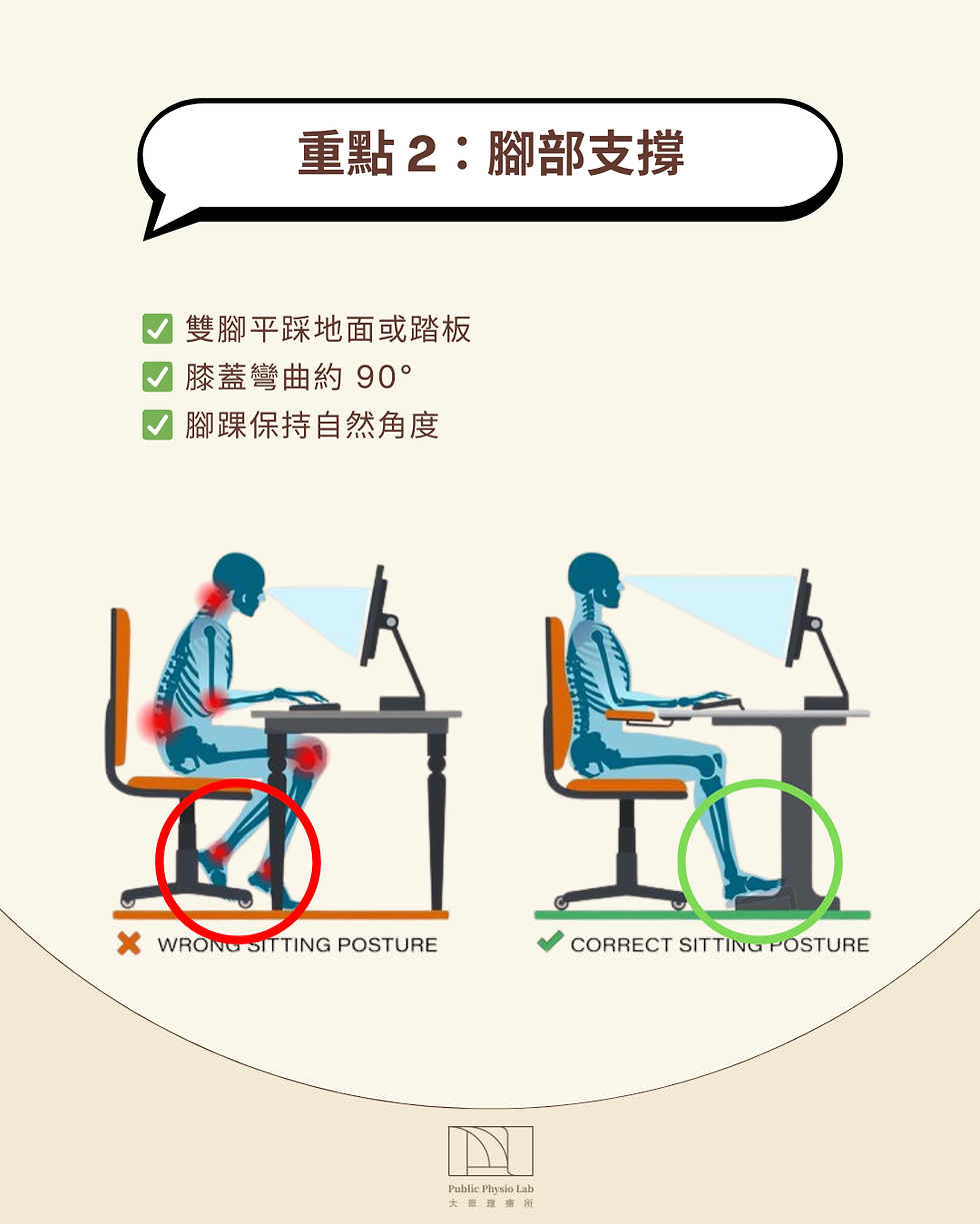 2️⃣ 確保雙腳平放 腳要踩實地面,如果踩不到,建議用腳踏板,讓膝蓋維持約 90°,減輕大腿後側壓力。